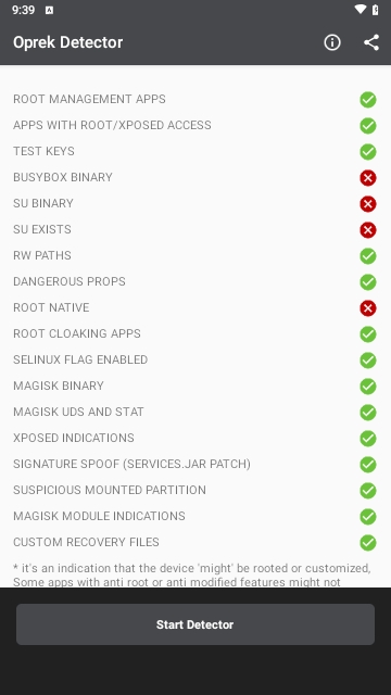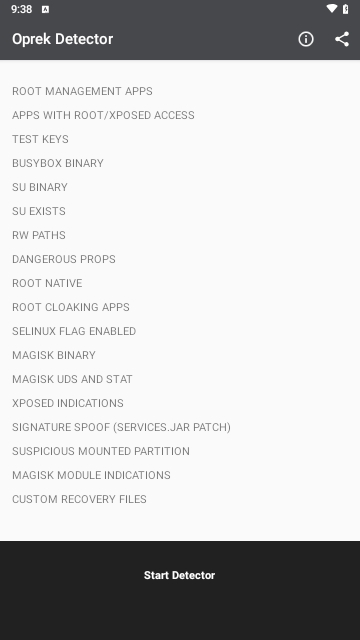 root检测工具(Oprek Detector)是一款非常专业的检测工具,用户使用这款软件能够快速扫描检测出自己的手机时候进行root,支持手机用户尝试,还可以使用这款软件来检测手机的各种硬件信息、获取手机参数、进行后台查杀等等。