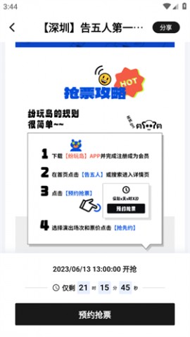 大家可以注册成为纷玩岛的会员,这样就能体验抢先约的购票玩法,帮助大家快人一步开始抢票!