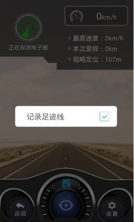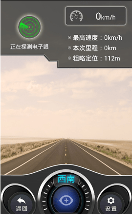 1.电子眼,左上方可显示遇到的电子眼,右上方显示时速,最高速度,本次里程,粗略定位。