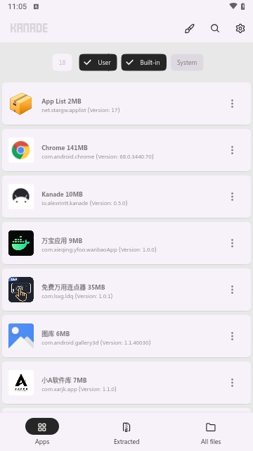 Kanade是一款专门进行提取apk文件的工具,不管是从手机系统工具,还是手机安装的文件中都能开启,这样得到的使用效果更好,让不同的apk安装包在更多的设备上直接使用,这样得到的限制性更小,每一次的提取都不需要很长时间的。