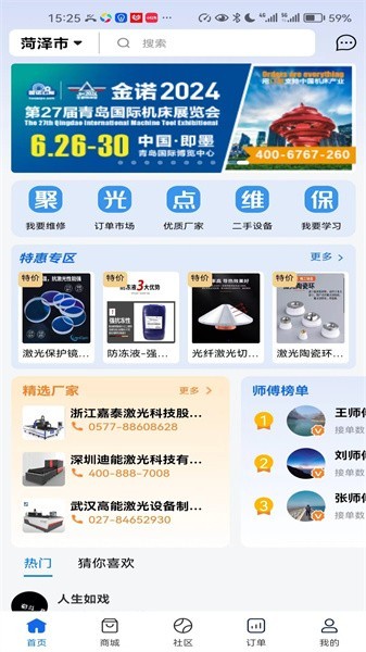聚光点维保app是一款激光设备维修保养服务平台,平台拥有首页,商城,社区,订单,我的等等功能板块,可以帮助更好的激光服务,需要的朋友欢迎前来下载使用。