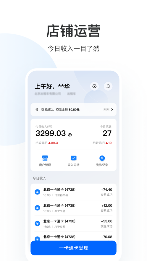 可用于巡游出租车司机、餐饮、便利店、商超、旅游等领域,提供商户入驻、交易受理、交易订单查询、交易数据统计等服务。