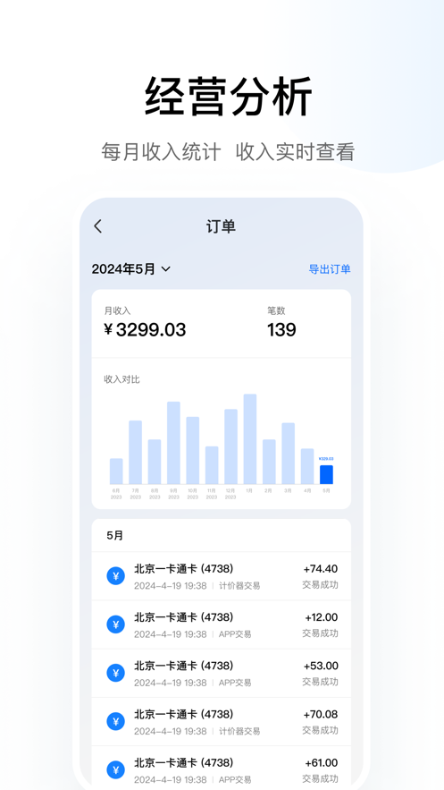 订单查询:支持出租车司机及商户对交易订单进行查询及统计,可用于交易对账。