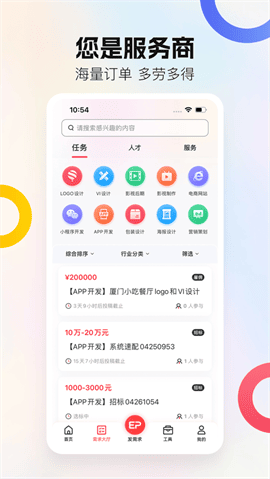 根据自主时间与雇主进行洽谈、接单,线上就可享受从接单到项目款项结算的一站式服务,平台任务日均超5000+,覆盖全行业,所有任务均可在线上实现洽谈和完成。