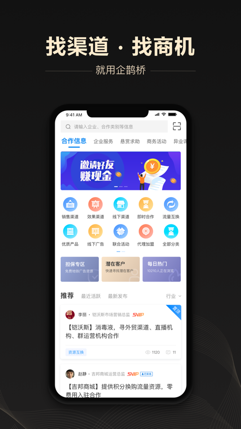 企鹊桥app下载是一款在线合作洽谈平台,平台极简发布,在线直聊,还拥有智能搜索,一键刷新与置顶等等功能特色,可以帮助更好的地推拉新、创业副业、招商加盟。