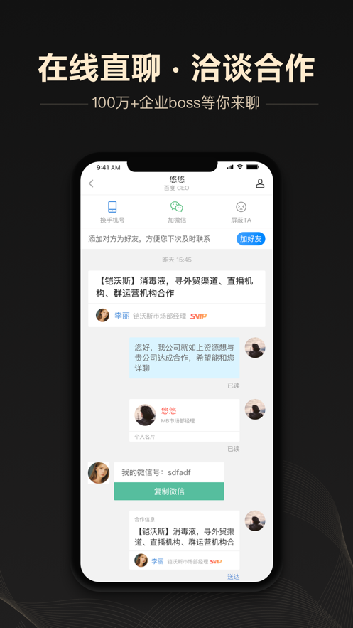 覆盖全国99%的地级市用户与企业,打通城市之间的合作边界,在线直聊洽谈合作,打电话、加微信、app内密聊多种沟通方式跨城市跨区域开展合作
