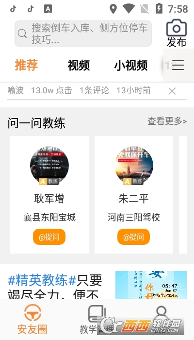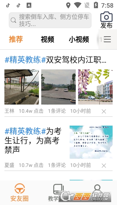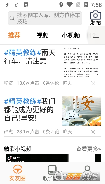 安安车生活是重庆安运科技股份有限公司开发的一款集分享,交流,小视频,科目试题练习等于一体的围绕驾驶学习为主题的APP