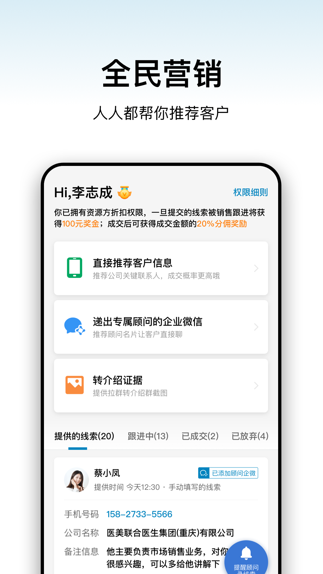 合伙人推荐线索,引荐有奖励,成交拿分佣,线上可提现