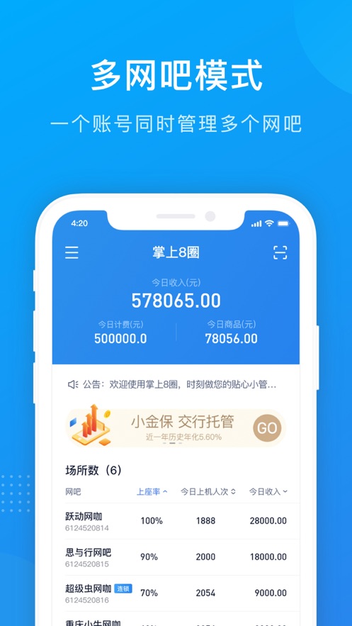 掌上8圈app下载安装是专为广大网吧老板/店长制作,软件拥有上机信息,营业收入,消息推送等等功能服务,可以帮助用户更好的经营管理网吧。