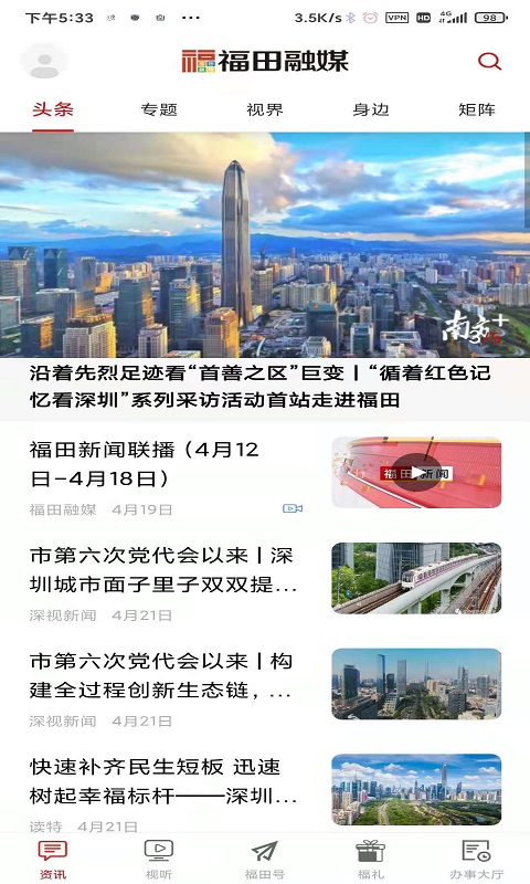 立足福田区,是集新闻资讯、政民互动、视听直播、福礼领取、便民服务等于一体的移动互联网应用平台,是福田新闻宣传和推外推介的平台,是传播福田主流价值的重要宣传阵地。