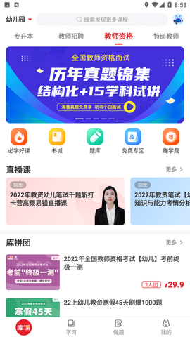 新人注册享好礼新人注册成功,或首次登录成功,系统即自动发放500元优惠券至相应库课账户,优惠券可到个人中心-我的卡券查看。平台还给用户提供了免费专区,大量直播课、点播课、练习题库、模拟题库、真题库,不限数量、不限次数,可随时领取和学习。