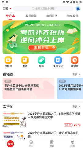 库课网校app破解版里面有很多关于专升本库课家专升本库课软件的资料,非常全面也非常管用,太喜欢了只要有了,它就可以通过自学考试考试拿到专升本了,课程保证让你满意,感兴趣的快来下载吧!