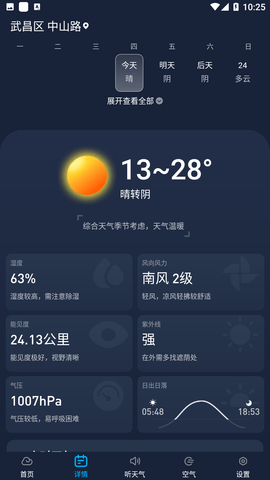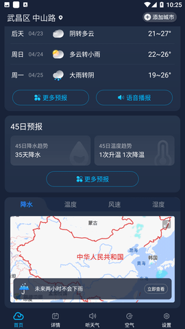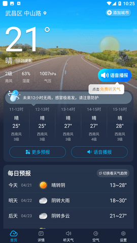这是一款实用的天气预报软件,实时对天气信息进行检测,与权威的天气观测站合作,将每日的天气以及未来45天内的天气预测推送到用户的手机当中,并且还能检测每日的空气质量,让用户能够放心的出门。