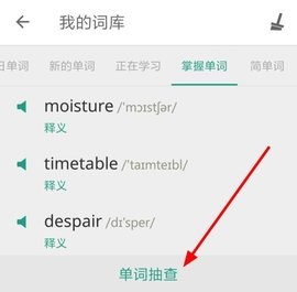 5、在我的词库页面中,点击掌握单词,向下滑动可以看到所有学过的单词,点击单词抽查可以检查自己还有哪些没有掌握