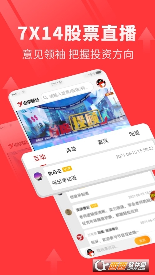 直播互动――16小时在线直播、女主播搭配嘉宾:左安龙、蔡钧毅、钱启敏等业内达人;毛利哥等平台大咖为用户提供即时深度的市场点评。同时直播随时与嘉宾互动、答疑、使用户获得股市中的大智慧。