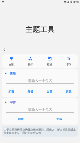 6、OneUI会通过检查apk安装来源:使得修改后的主题字体无法被应用,本应用可以修改安装来源为主题商店或应用商店,使修改后的主题或字体也能被应用和识别(由于OneUI的版本更新,OneUI3.及以上已经无法安装修改后的的主题了)
