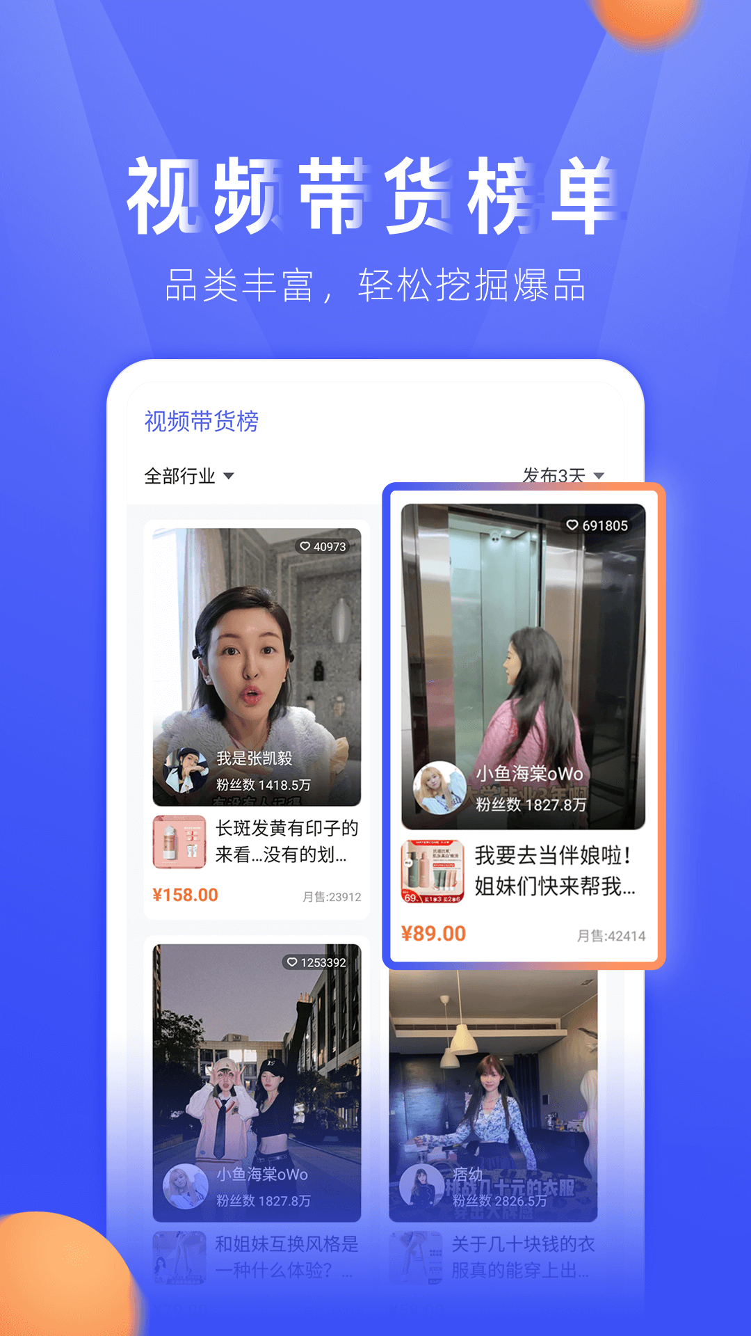 各种榜单任你查看,不同行业不同日期的视频带货榜、达人带货榜、达人涨粉榜等榜单,更有推广数据给你参考。