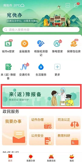 1、进入“宛快办”APP首页后,点击下图中红框所示入口,进入来(返)豫报备系统