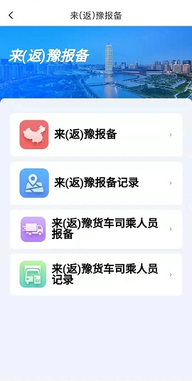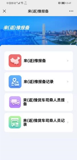 用户根据自己实际情况选择来(返)豫报备或来(返)豫货车司乘人员报备。若用户已经报备,也可通过此页面查看相应记录。
