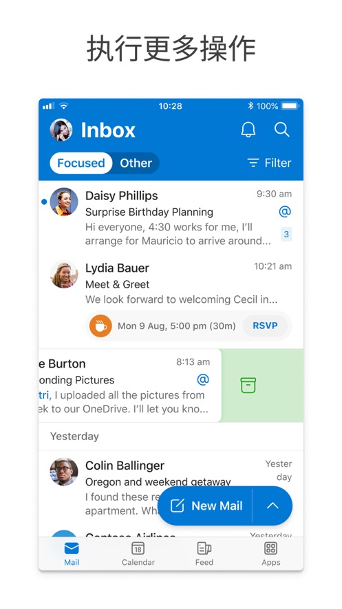 先显示最重要邮件的重点收件箱,外加轻扫手势和智能筛选器,实现收件箱无缝管理。