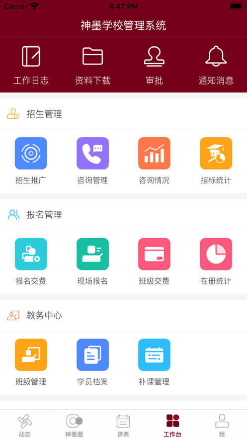 神墨教育,是神墨教育总部为盟校提供的定制化高效办公平台,其中资讯板块、总部职能与总部通讯录、课程查询、盟校通讯录、文件资料更是为盟校了解总部和查找其他盟校提供了方便,使盟校与总部有了高效的沟通与连接。