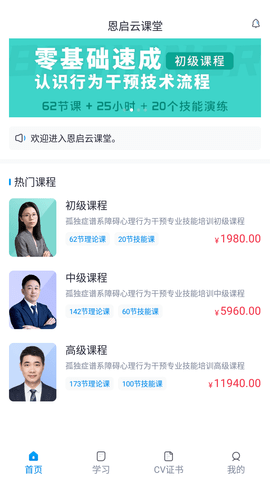 恩启云课堂app安卓版是一款专门提供孤独症谱系障碍心理行为干预专业技能培训平台,里面有着海量的学习课程,能够让你零基础快速认识行为干预技术流程,内容丰富,有需要的用户快来下载吧!