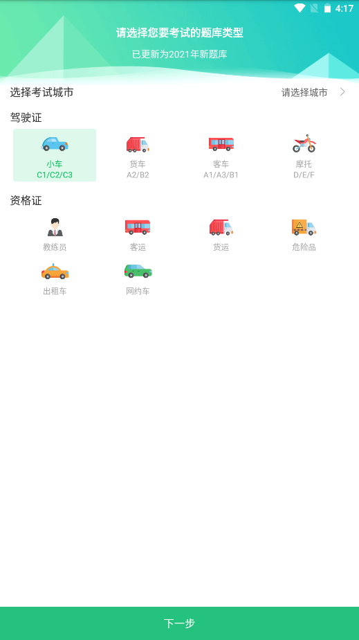 1、主动进行驾照选择,用户们可以根据自己需要考试的驾照,需要开的汽车,来选择自己需要进行的练习试题,这样针对性更强,学习更高效;