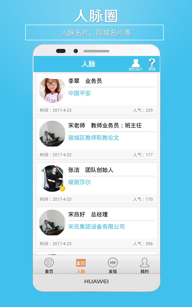 用户可以在海量的微名片用户群中,按行业、职位、地域等属性搜索商友,轻松拓展人脉资源。