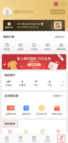 1、在“个人”页面中在“我的服务”一栏中,找到“设置”按钮;