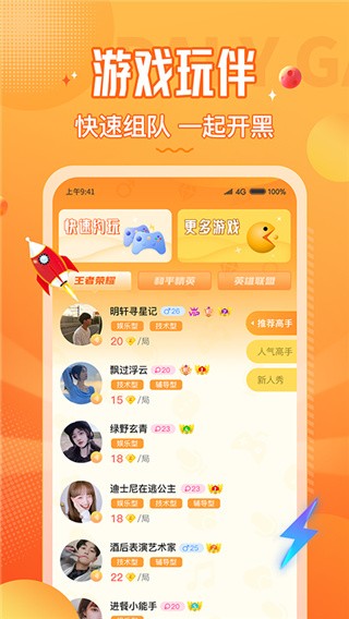 一款全新的游戏辅助应用,上面有大量的陪玩人员,学生陪玩者更是不少,有颜有技术,在线连麦游戏配合度更高,快来寻找与你一起畅玩的小伙伴吧!