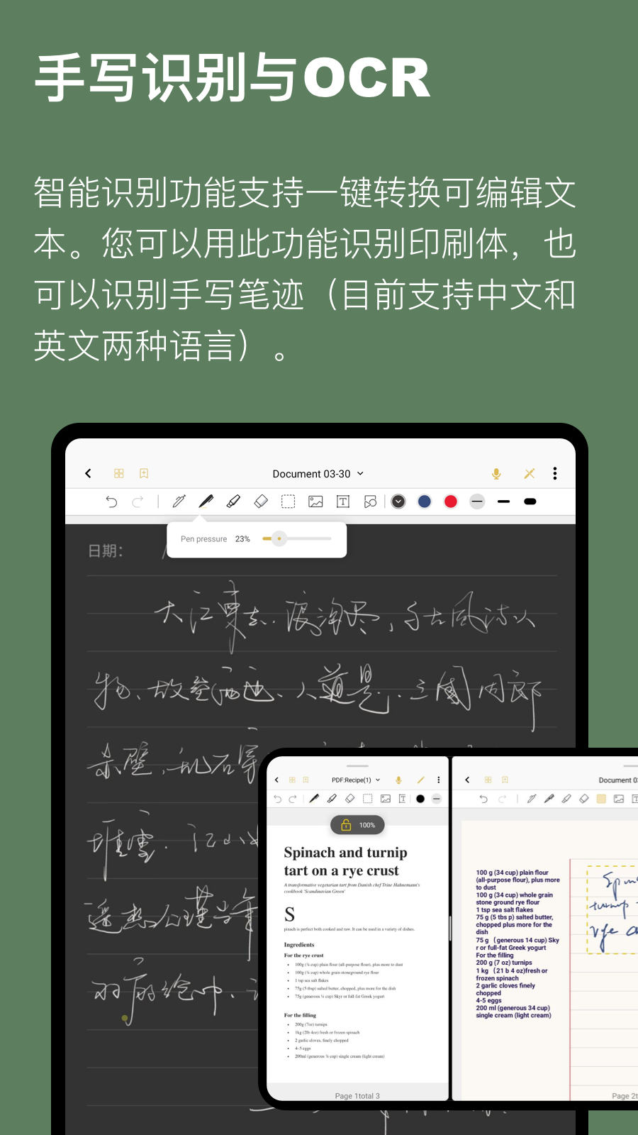 开启OCR手写识别功能,配合套索工具,您可轻松地将指定的手写笔记及PDF内容转换成文本,便于您高效整理、编辑并输出自己的笔记内容。