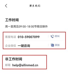 2、之后就会在【联系我们】的界面下面看到:工作时间咨询方式和非工作时间咨询方式,按照自己需求选择就可以啦~