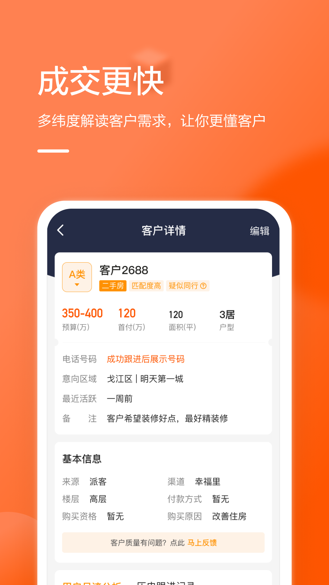 幸福客app下载是专为房产经纪人制作,软件拥有客户分类管理,客户需求解读,历史行为记录,房源一键分享等等特色,可以帮助经纪人更高效智慧工作。