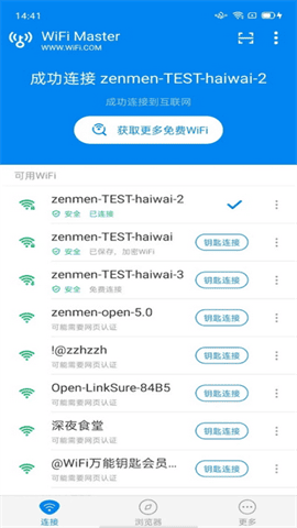 WiFi万能钥匙国际版,也就是wifi master(wifi大师)这款软件能够最大化使用各种联网的移动服务,扫除无网断网的状态,而且使用WiFi万能钥匙国际版你还能够查看到你所连接过的WiFi网络的密码,感兴趣的朋友们,快来本站进行下载体验这款软件吧。