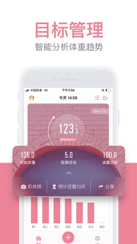3、体重列表、柱形图、趋势线、百分比圆环等多种方式为您展示减肥进展