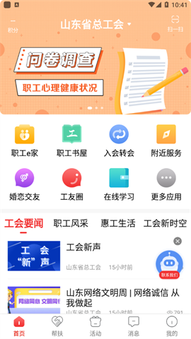 齐鲁工惠app是山东省总工会官方推出的普惠服务职工平台,平台拥有入会转会,职工e家,就业服务,学习,婚恋交友等等功能服务,可以帮助更好的服务职工会员。