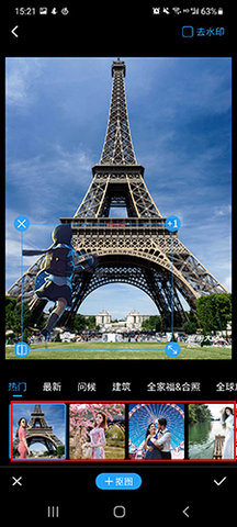 通过人工智能自动识别图片中的人像并实现自动抠图,您可以添加多张人像图,还可以直接复制,随意调整人像位置大小,发挥自己的想象力,名人合影、隔空合照变得轻而易举。