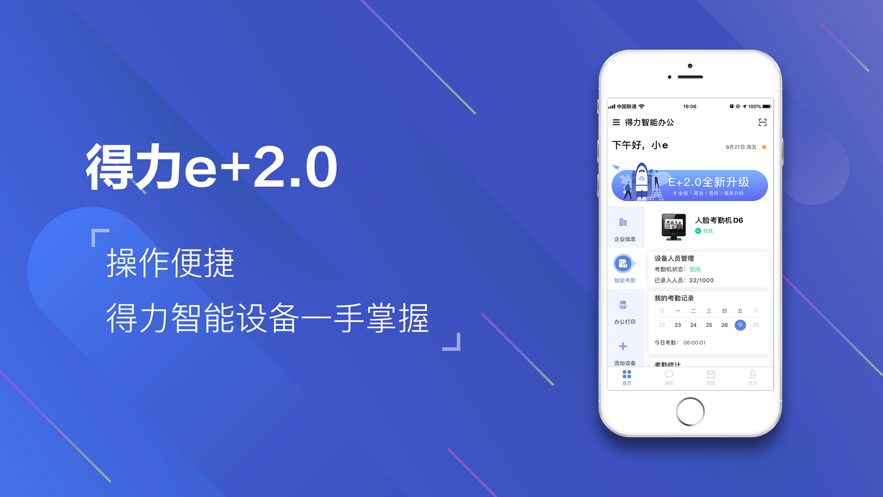 得力e+是国内领先的综合办公用品供应商得力集团研发的集智能硬件管理、通讯、协同办公为一体的智慧办公平台。
