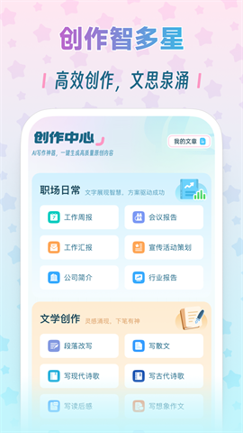 2、【创作中心】只需选择模板,填好要求,即可一键生成文章