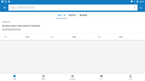 1、词典页面:用户可以输入要查找的法语单词,还能进行每日一句、每日听力、每日配音学习