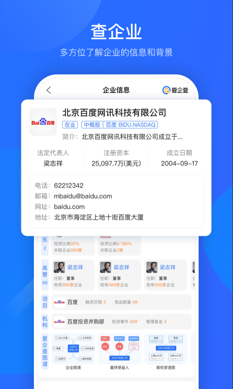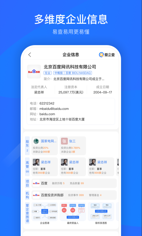 爱企查app依托百度强大的大数据和AI技术,用户可以一键查询企业所有工商信息、股权结构、商务纠纷,免费获取企业真实经营状况!
