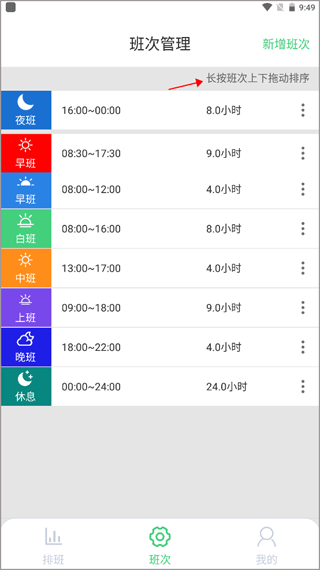 4、你还可以长按其中一个班次进行上下拖动,调整好顺序。