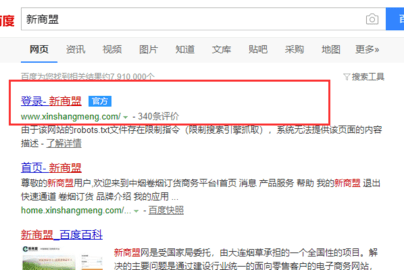1、在电脑的百度上输入新商盟,找到其官方网站以后点击进入。