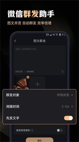 2. 群发助手:无论是文字、图片、视频、收藏,还是链接、公众号、小程序、名片,统统支持,一键群发让推广更高效。