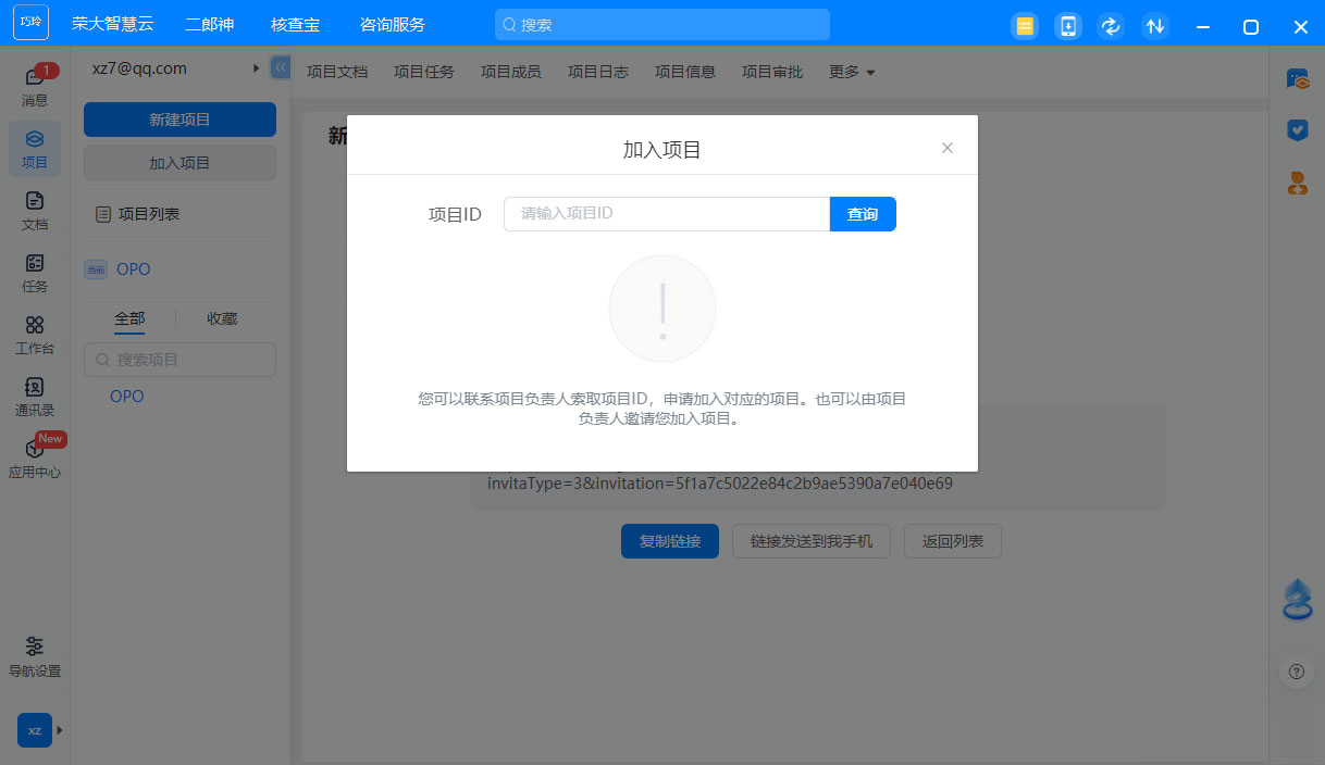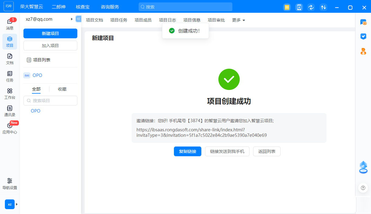 9、项目创建完毕,可以复制链接地址发送给其他用户,可以在电脑加入项目,可以在手机加入项目