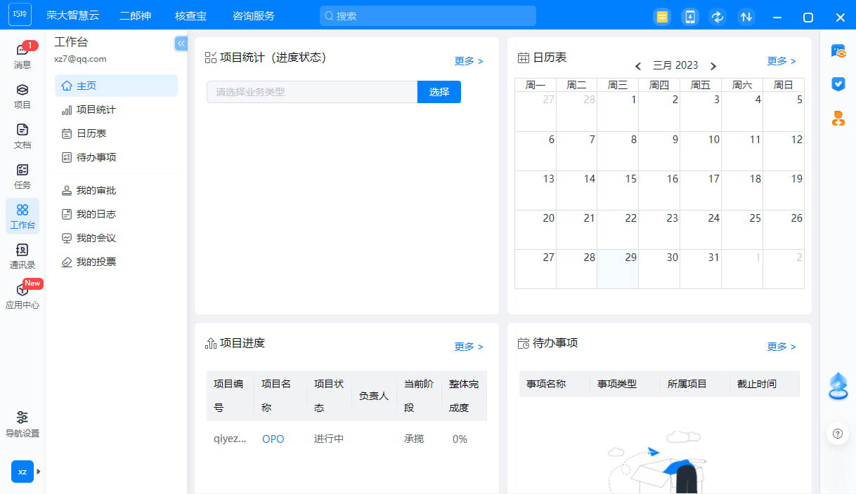 11、工作台界面,可以在这里查看项目统计、日历表、待办事项、我的审批、我的日志、我的会议、我的投票