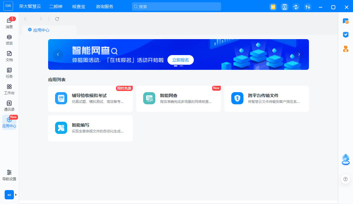 13、应用中心:辅导验收模拟考试、智能网查、跨平台传输文件,如果有需要的应用就添加到软件