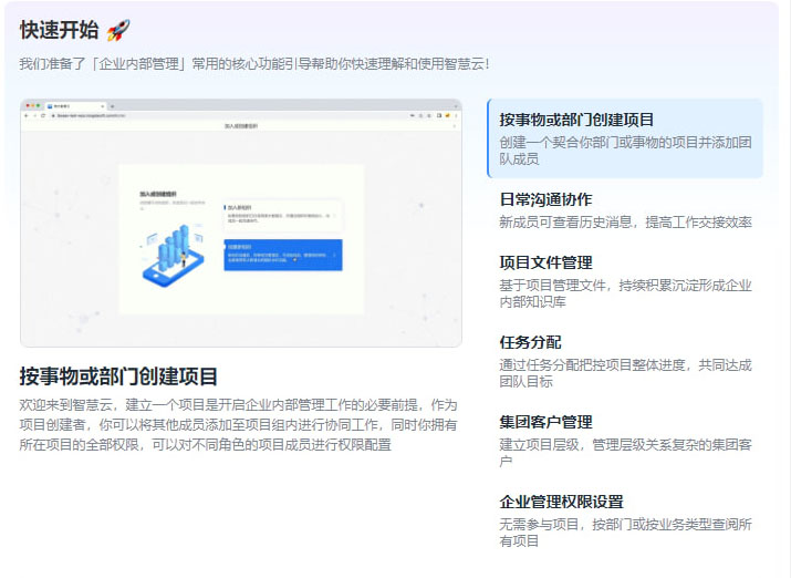 欢迎来到智慧云,建立一个项目是开启企业内部管理工作的必要前提,作为项目创建者,你可以将其他成员添加至项目组内进行协同工作,同时你拥有所在项目的全部权限,可以对不同角色的项目成员进行权限配置