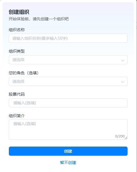 3、创建组织,开始体验前,请先创建一个组织吧,请输入组织名称(最多输入50字)
