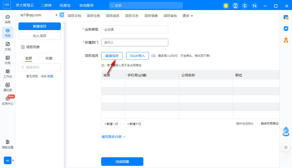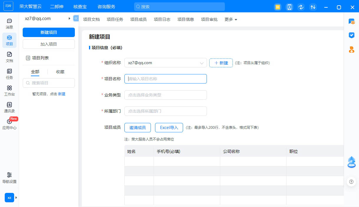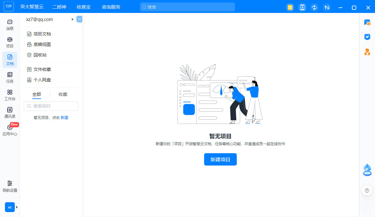 4、暂无项目,新建你的「项目」开启智慧云文档、任务等核心功能,并邀请成员一起在线协作